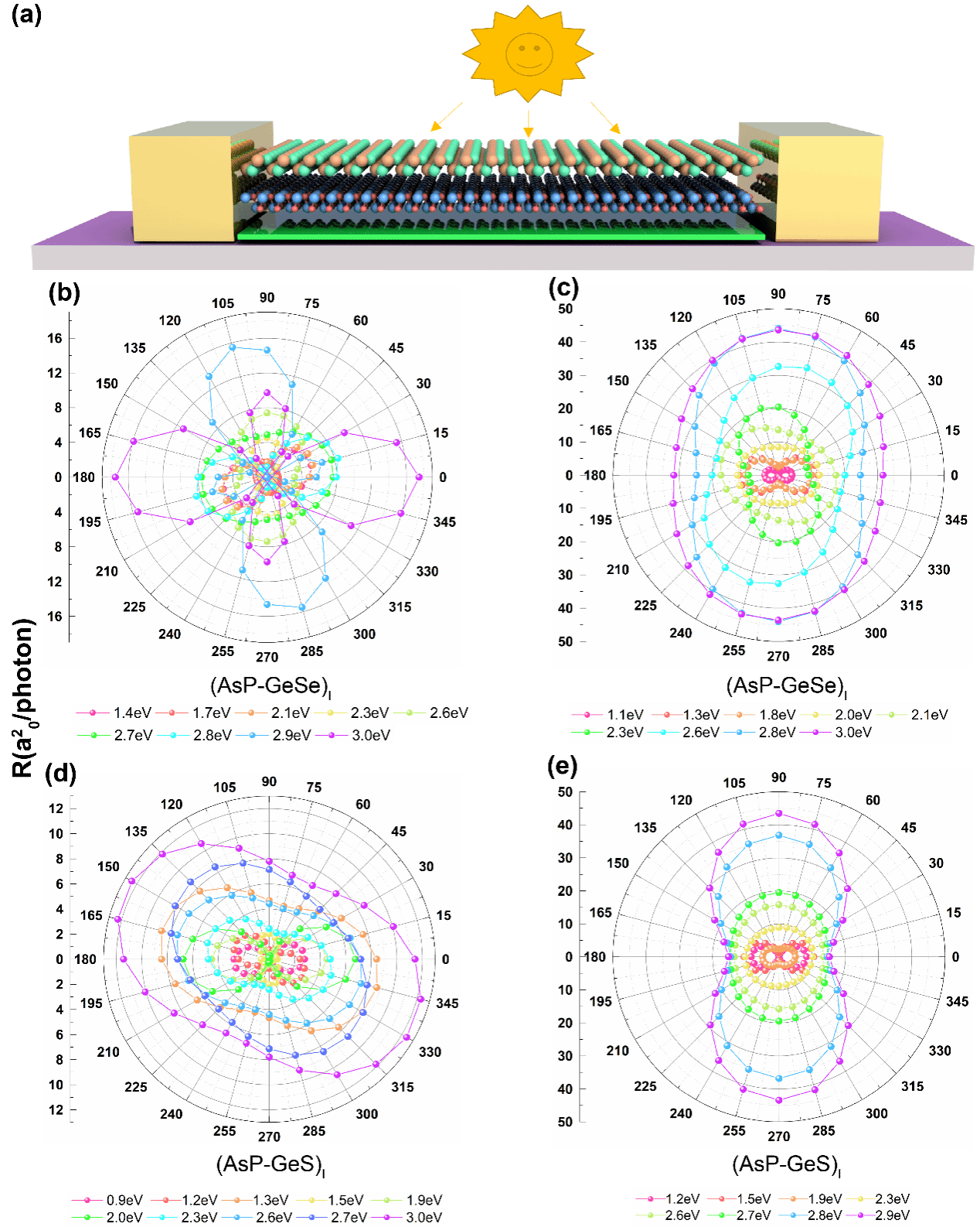 图1:基于(AsP−GeY)I和(AsP−GeY)V异质结光电器件的偏振各向异性调制模拟。(a)光电探测器期间模型。(b) (AsP−GeSe)I、(c) (AsP−GeSe)V、(d) (AsP−GeS)I、(e) (AsP−GeS) V不同光照射能量下光电流随角度的变化关系。